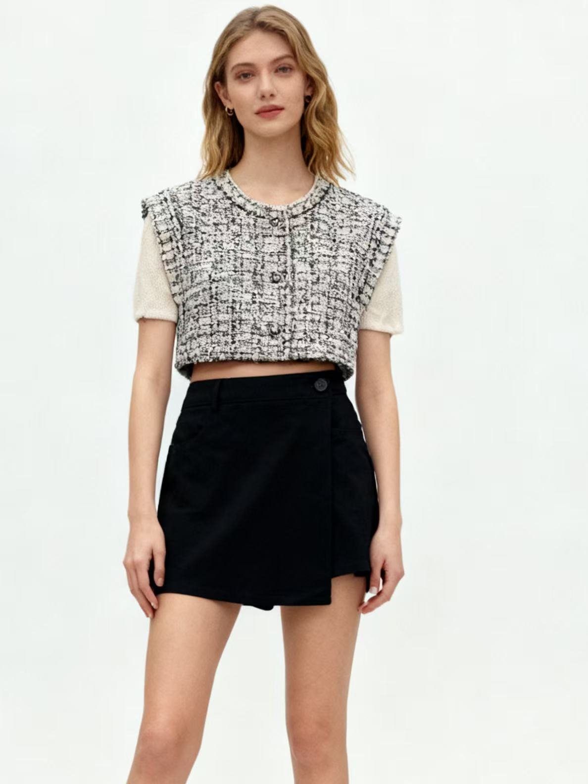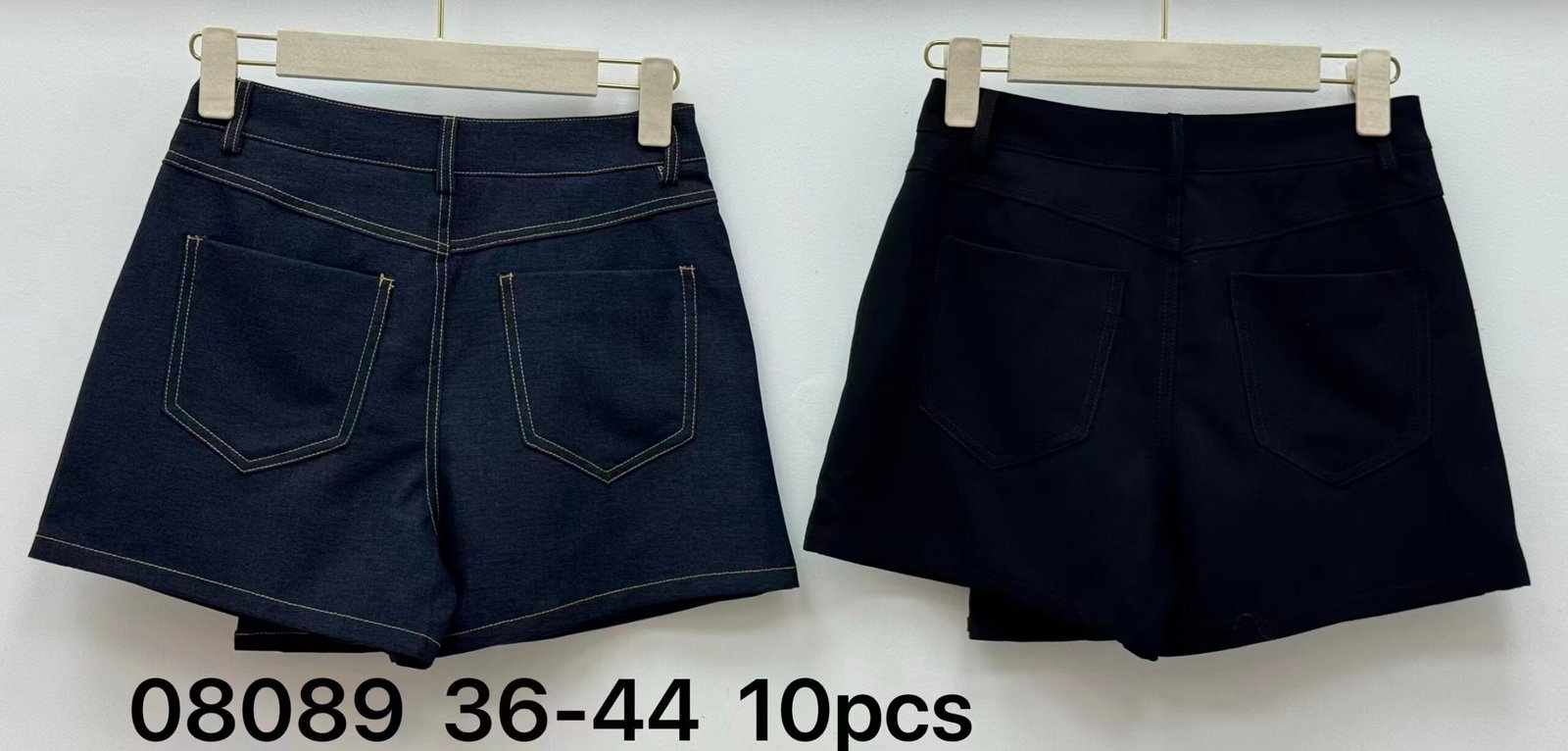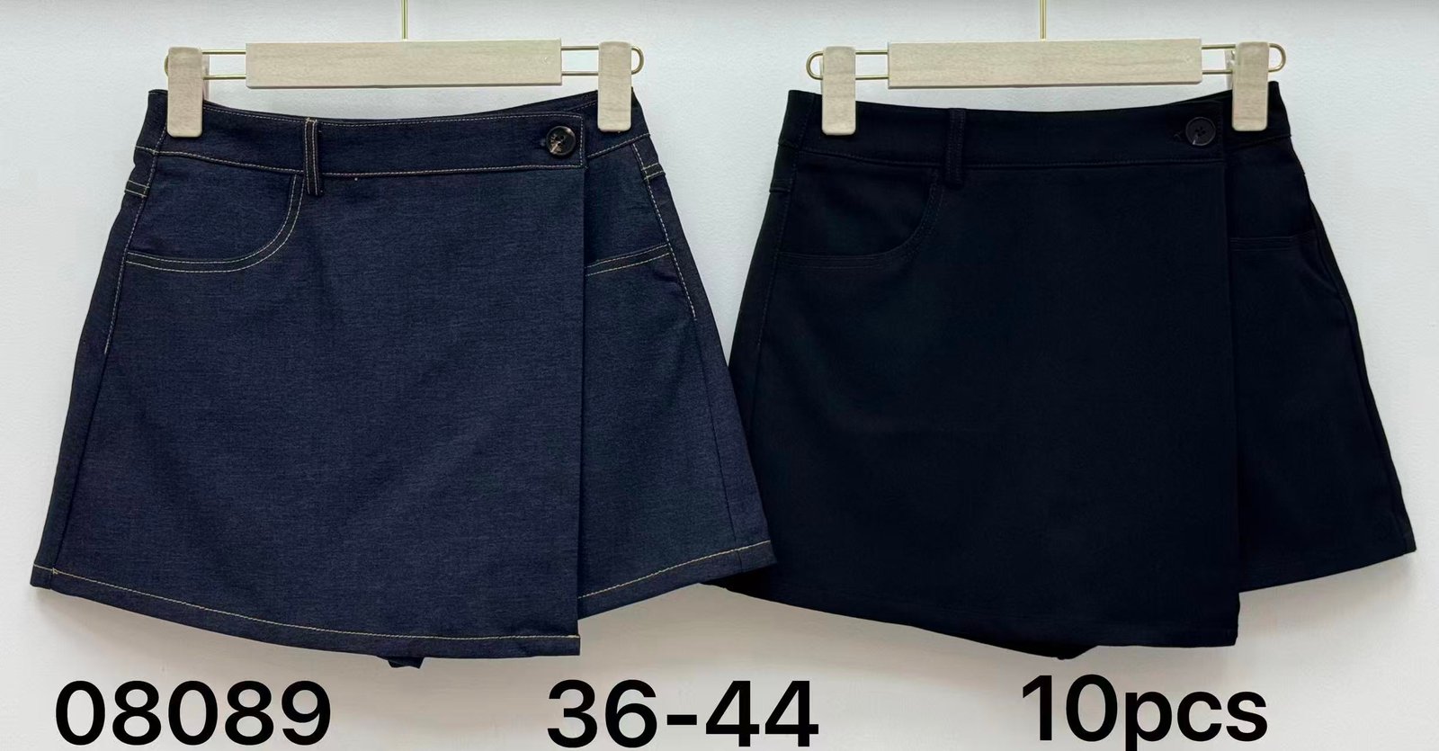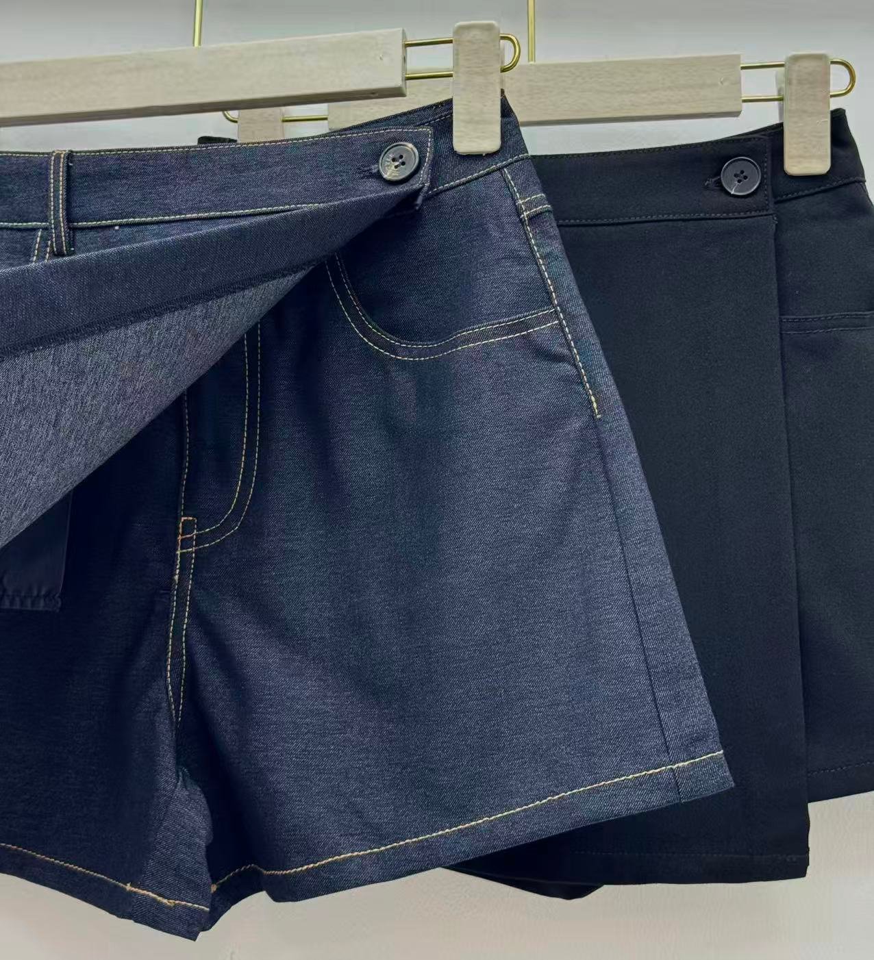 Falda pantalón vaquera en color azul marino y negro, con diseño envolvente y bolsillos