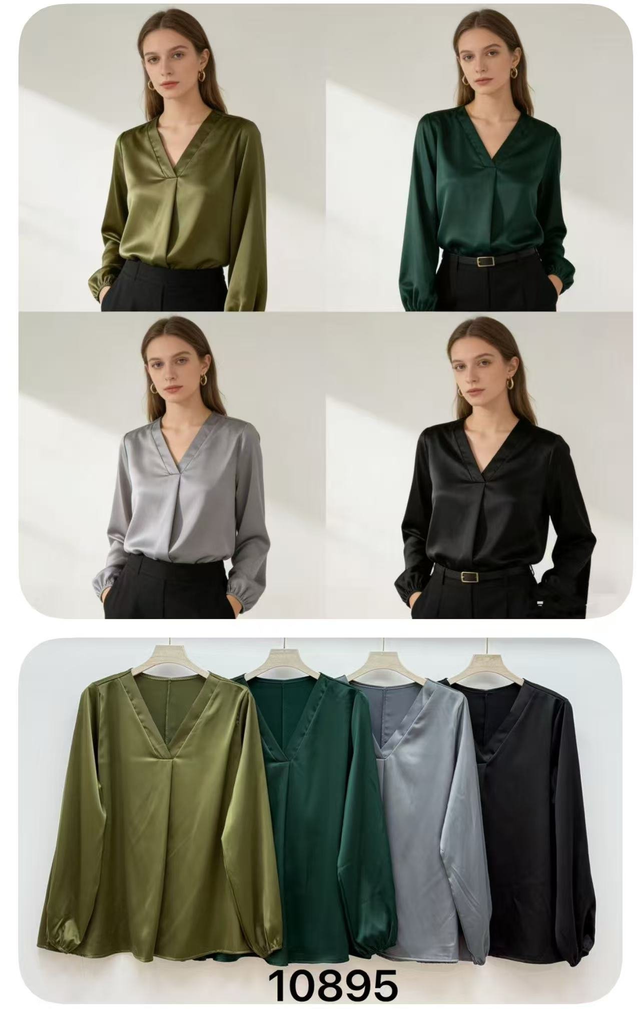 👚 Blusa satinada con cuello en “V” y manga larga abullonada
