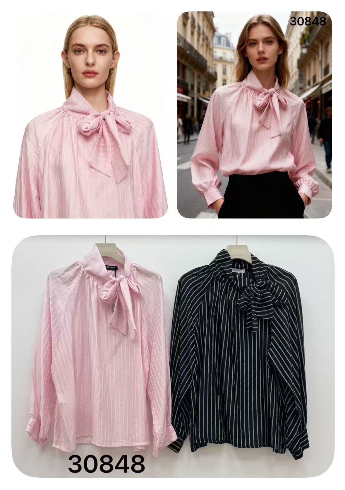 Tejido ligero con estampado de rayas finas, diseño femenino con gran lazada al cuello y mangas abullonadas. Perfecta para un look sofisticado tanto para oficina como para ocasiones especiales.