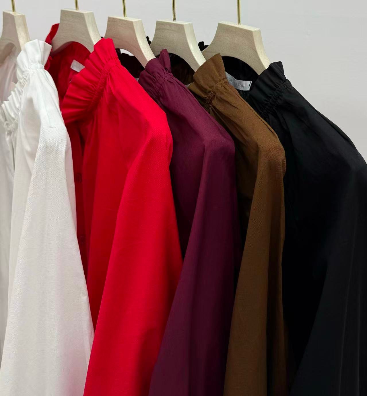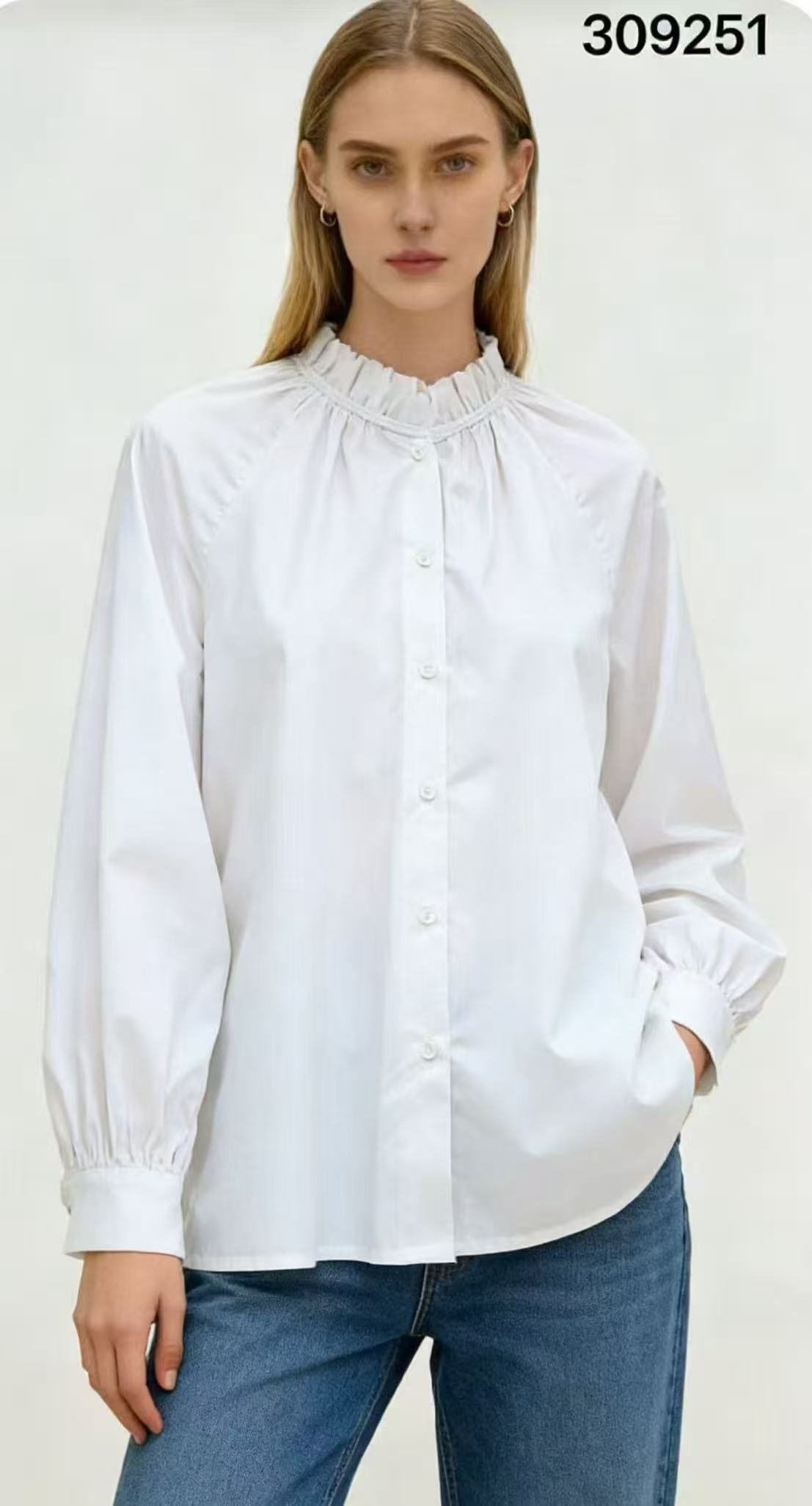 Blusa poplin lisa con cuello fruncido Tejido suave, corte cómodo y mangas abullonadas.
