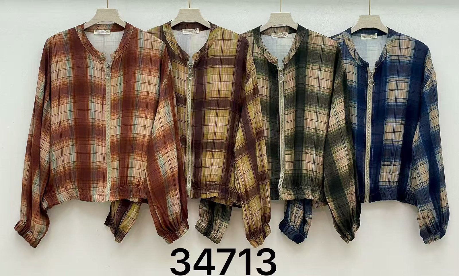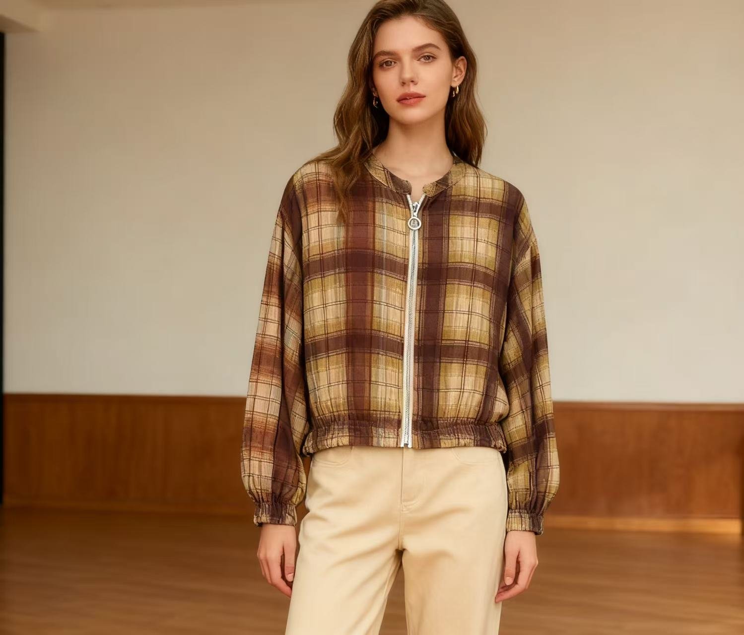 Diseño ligero con cierre de cremallera y cintura elástica para un ajuste cómodo. Estampado de cuadros clásico y versátil, ideal para looks casuales de entretiempo.