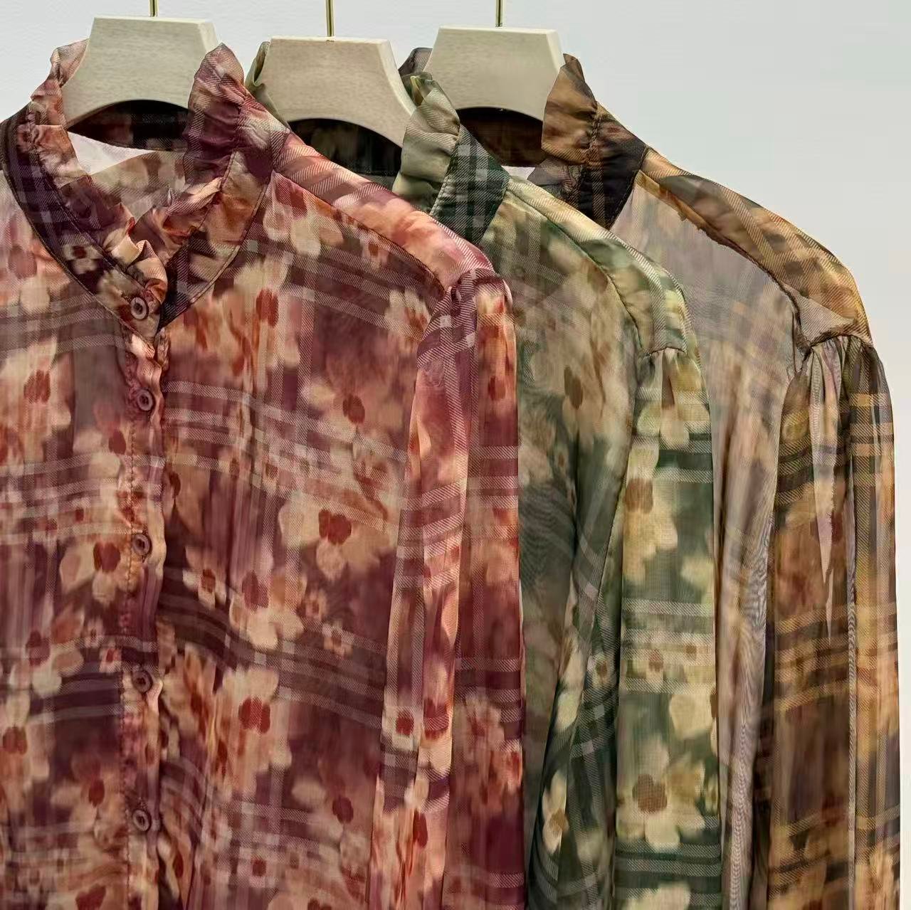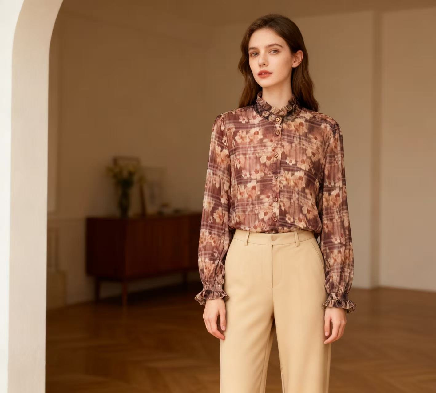 Diseño elegante con cuello mao y cierre de botones, estampado floral con efecto suave y femenino. Tejido ligero y cómodo, ideal para looks de otoño o entretiempo.
