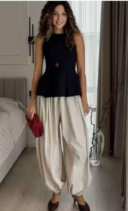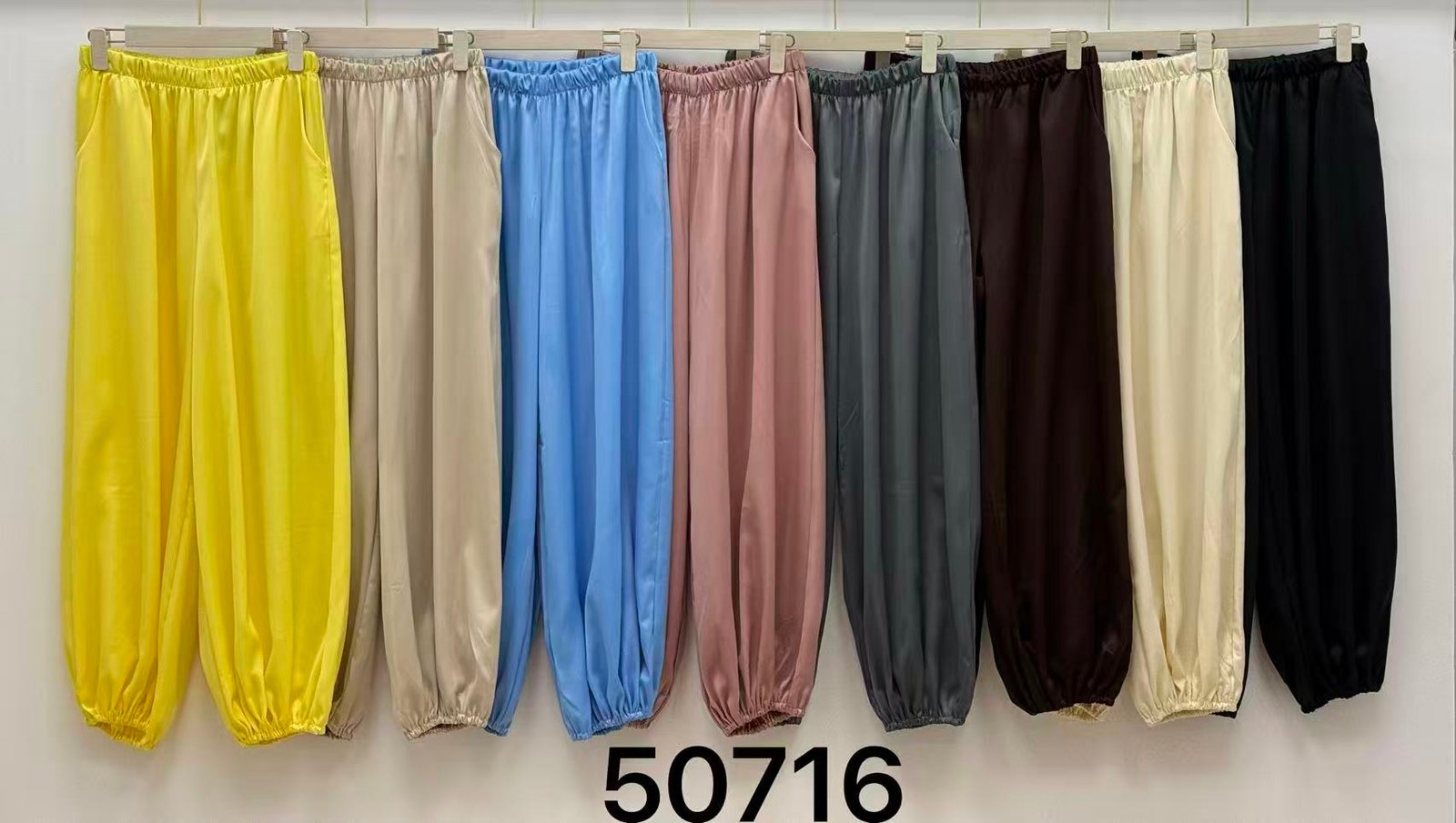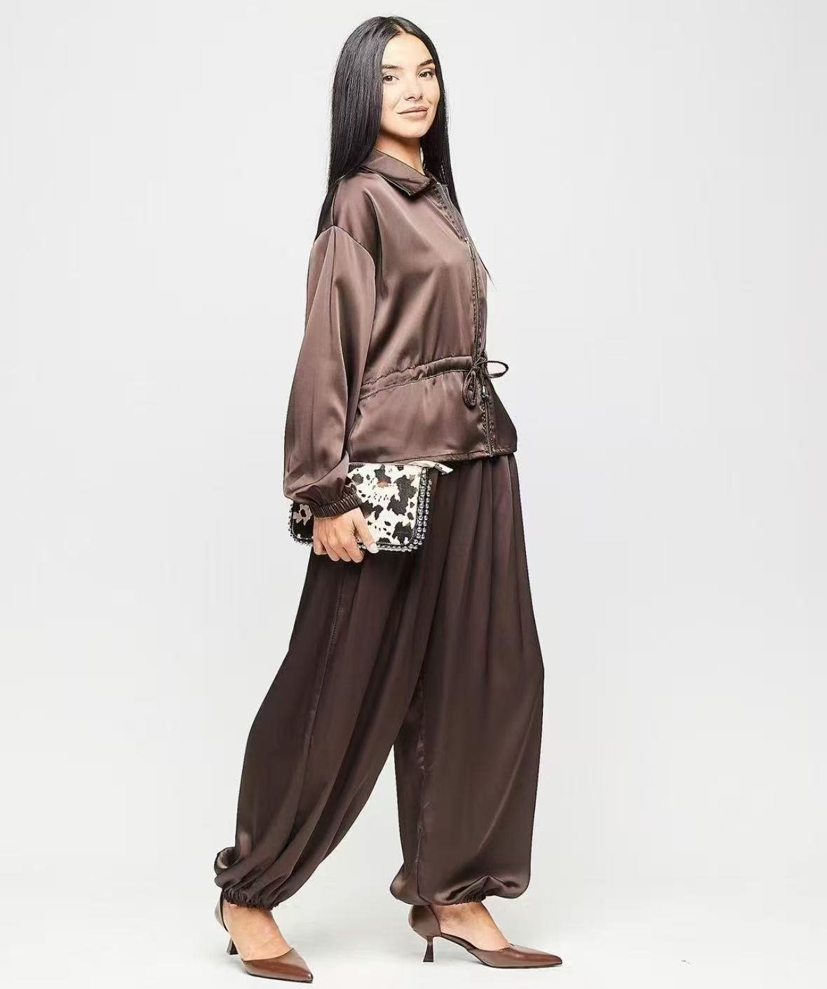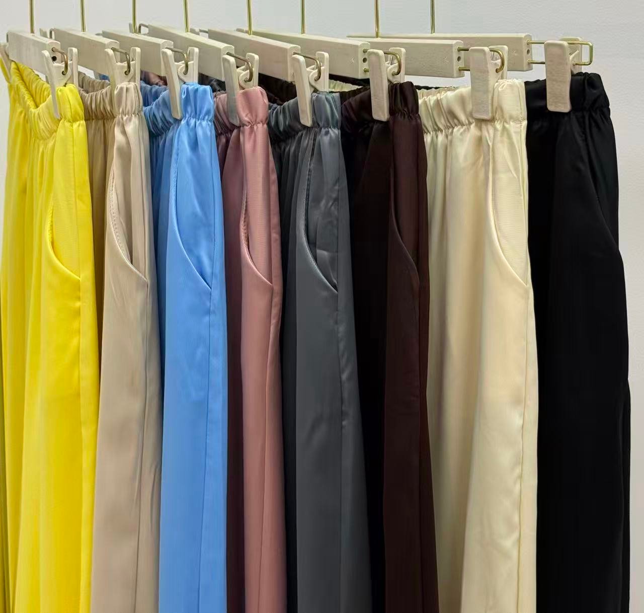 Pantalón bombacho con bolsillos 🩶 Tejido satinado con elegante 📏 Medida de la cintura: 36-38 cm 📏 Largo: 98-100 cm