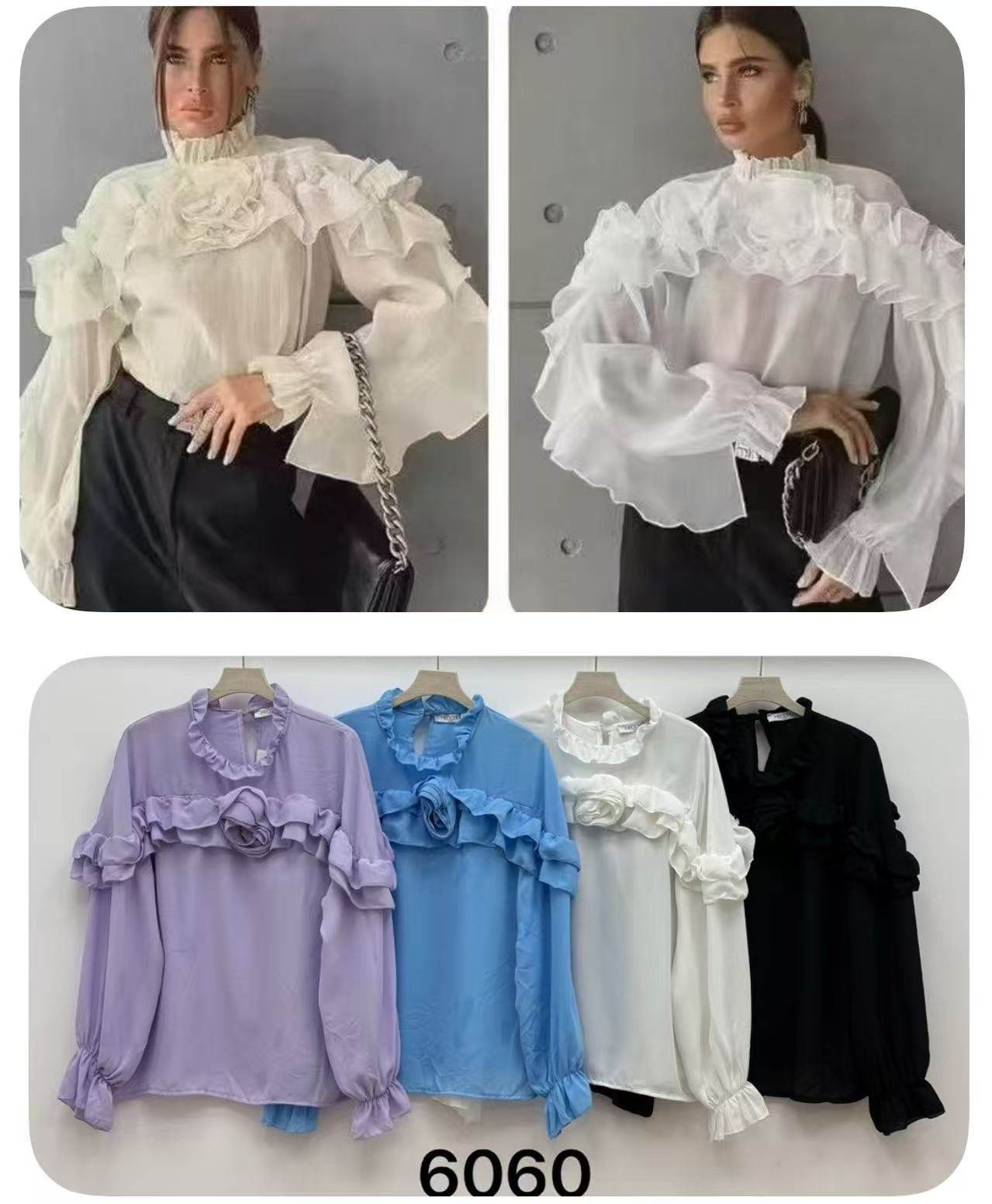 La blusa destaca por su cuello alto decorado con volantes y un gran flor en 3D