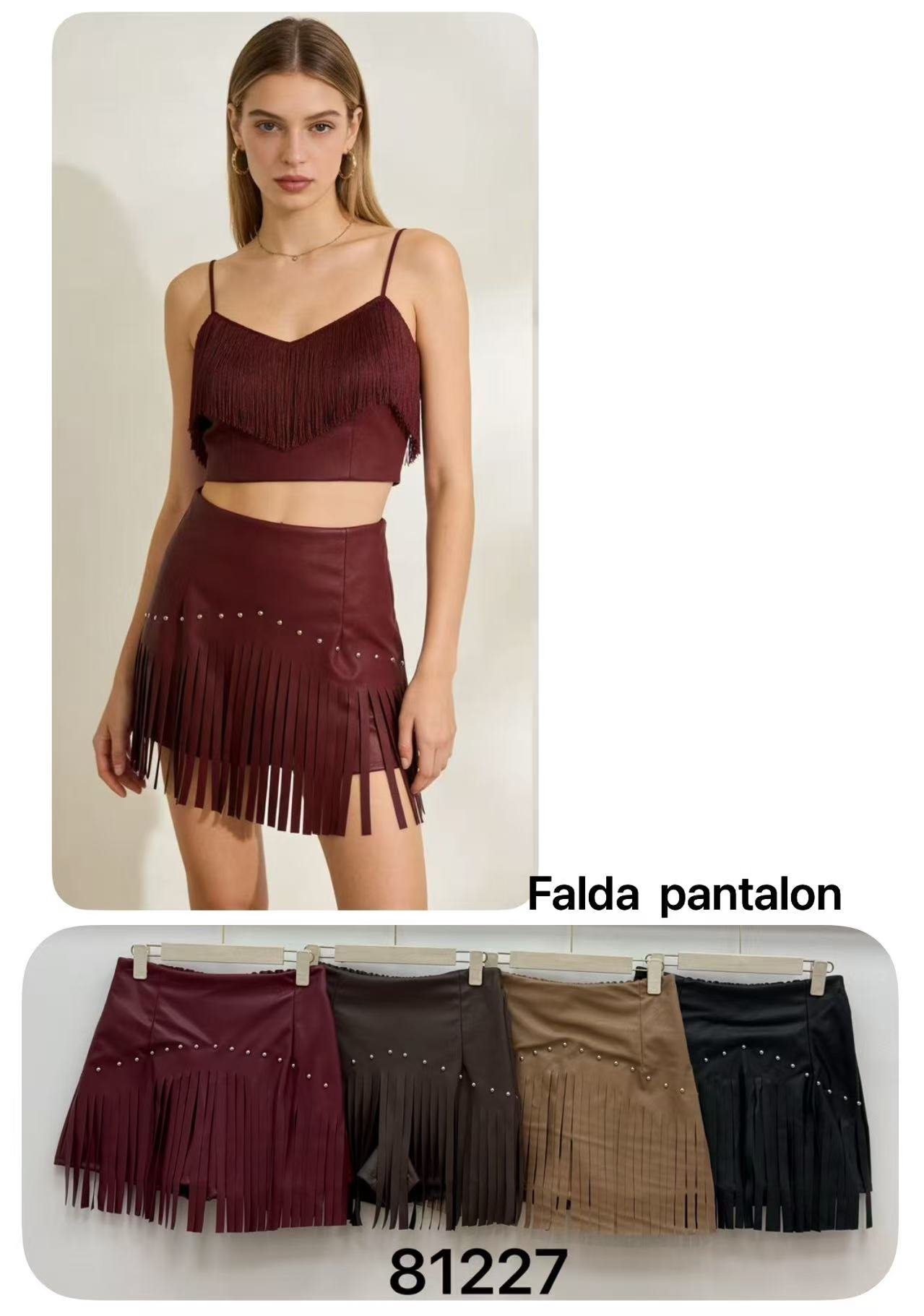 Falda–pantalón efecto piel con flecos y con tachuelas ✨
