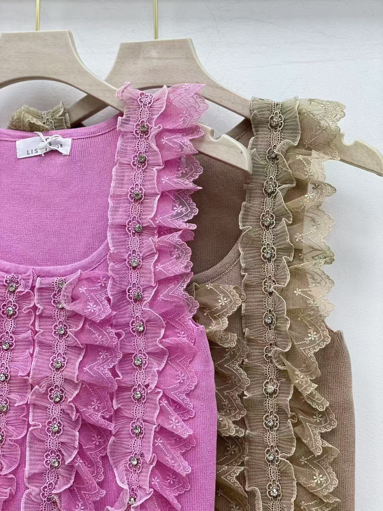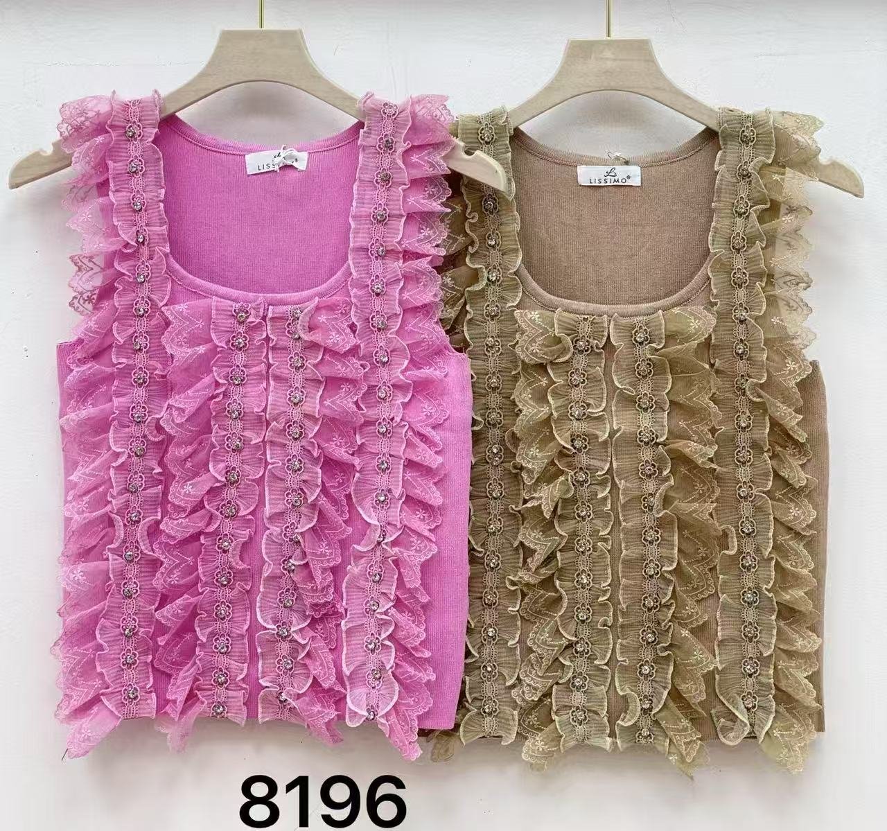 Camiseta punto✨ Diseño femenino con detalle de volantes y encaje en la parte frontal.