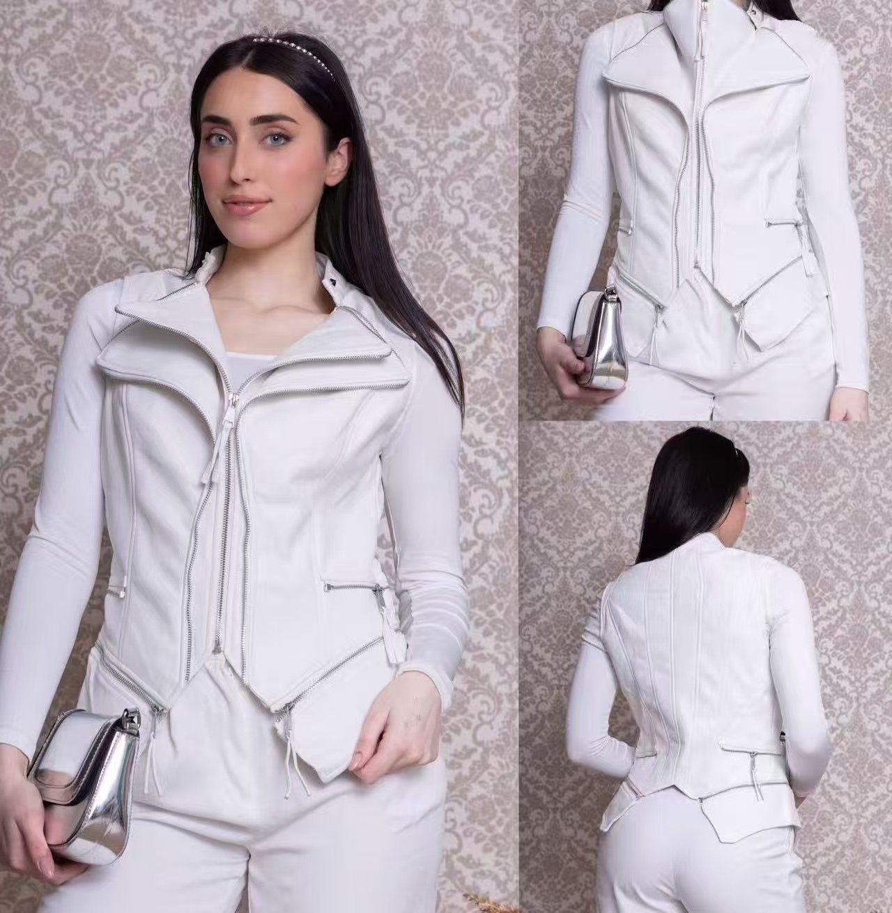 Diseño moderno con cierres de cremallera, cuello solapa y detalle entallado en la cintura que realza la silueta.