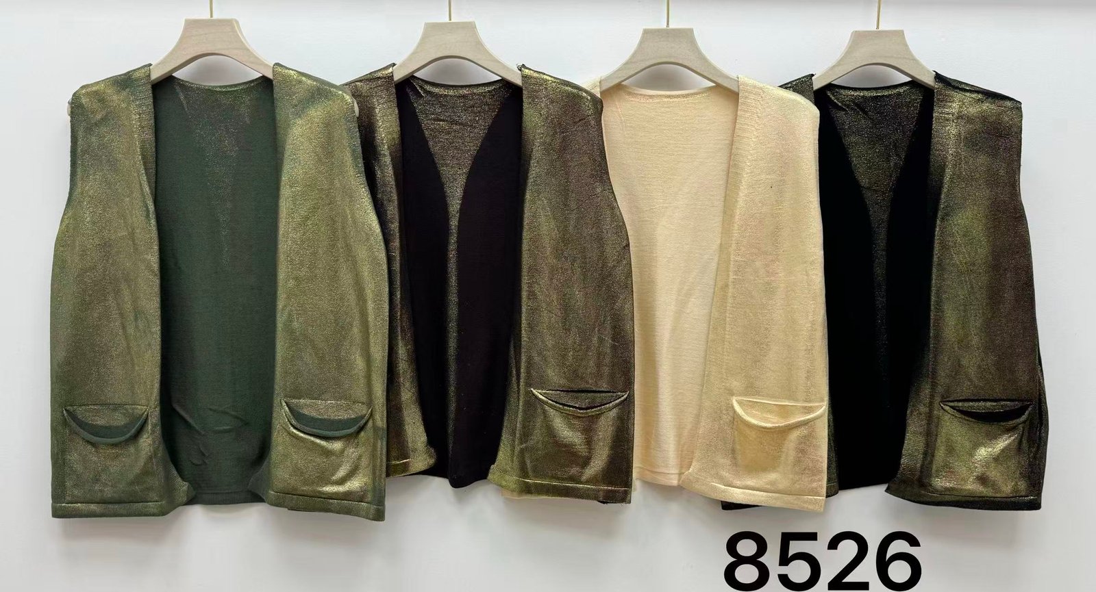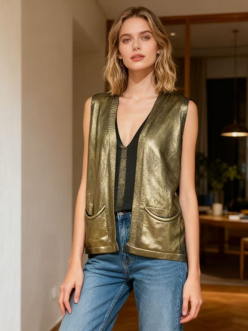 Chaleco de jersey ✨ Ligero y elegante, con bolsillos delanteros y efecto brillo ideal para elevar cualquier look.