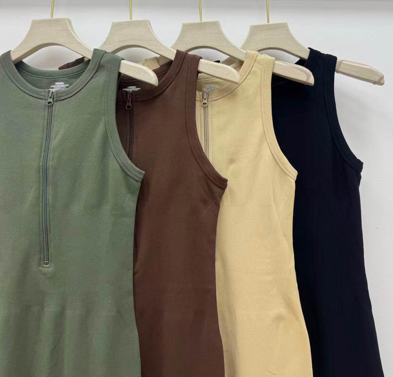 Tejido elástico de punto canale, diseño sin mangas con cremallera frontal. Ajusta y estiliza, ideal para entrenar o para un look sport moderno.